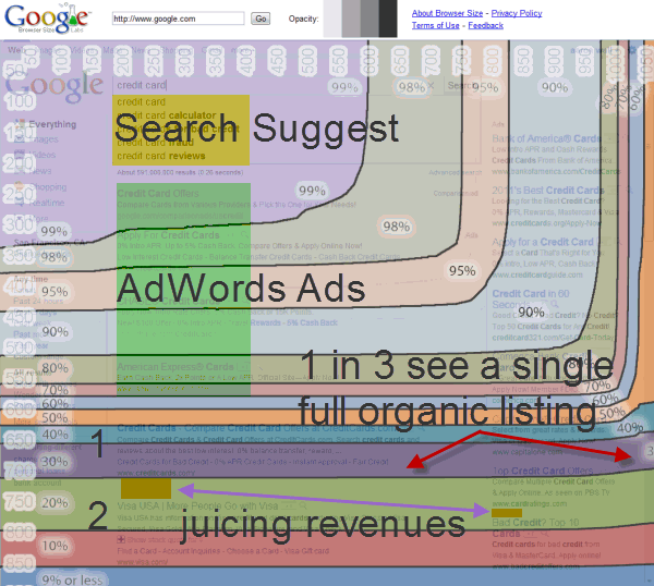For commercially viable keywords these have the net effect of pushing the organic search results further down the page. A recent study by Optify highlighted that while low CPC & tail keywords send most clicks (~89%) to the organic search results, for high CPC & head keywords AdWords ads consume most search clicks (~ 60%).